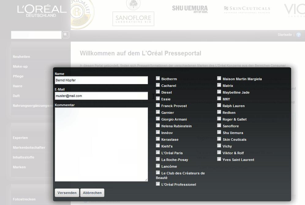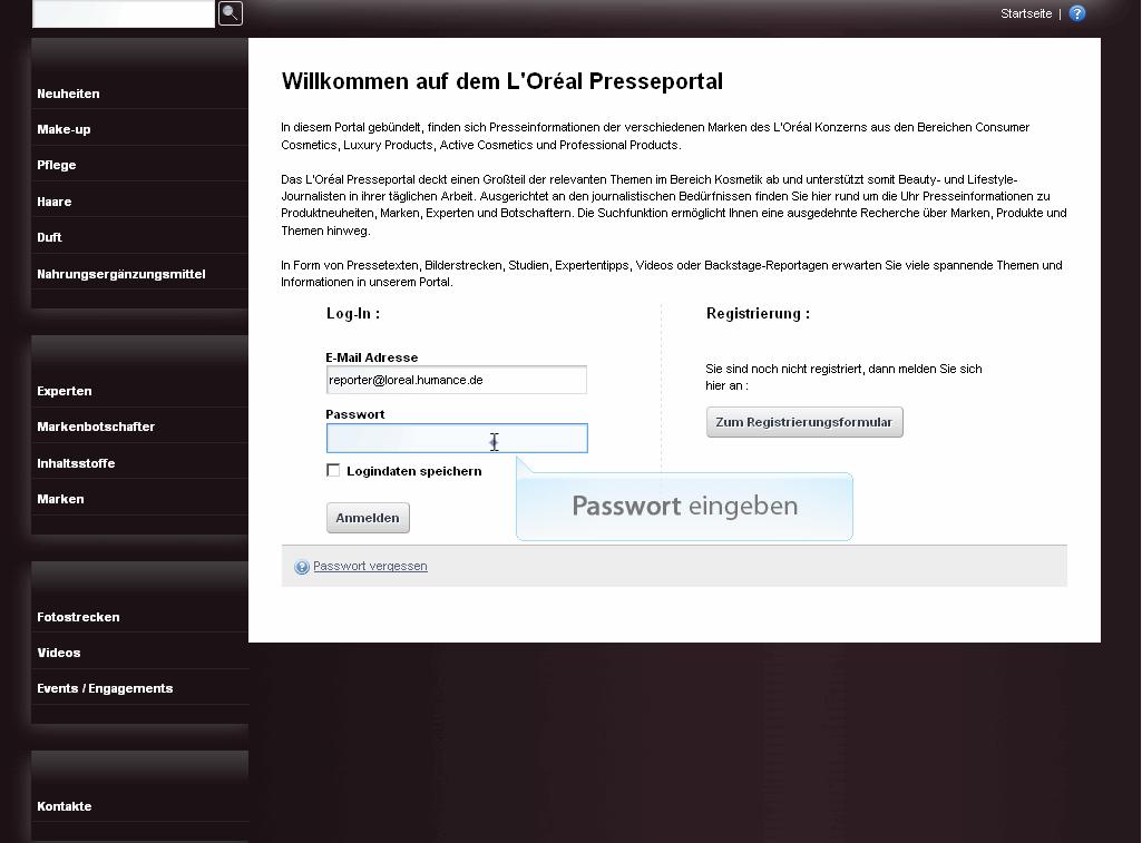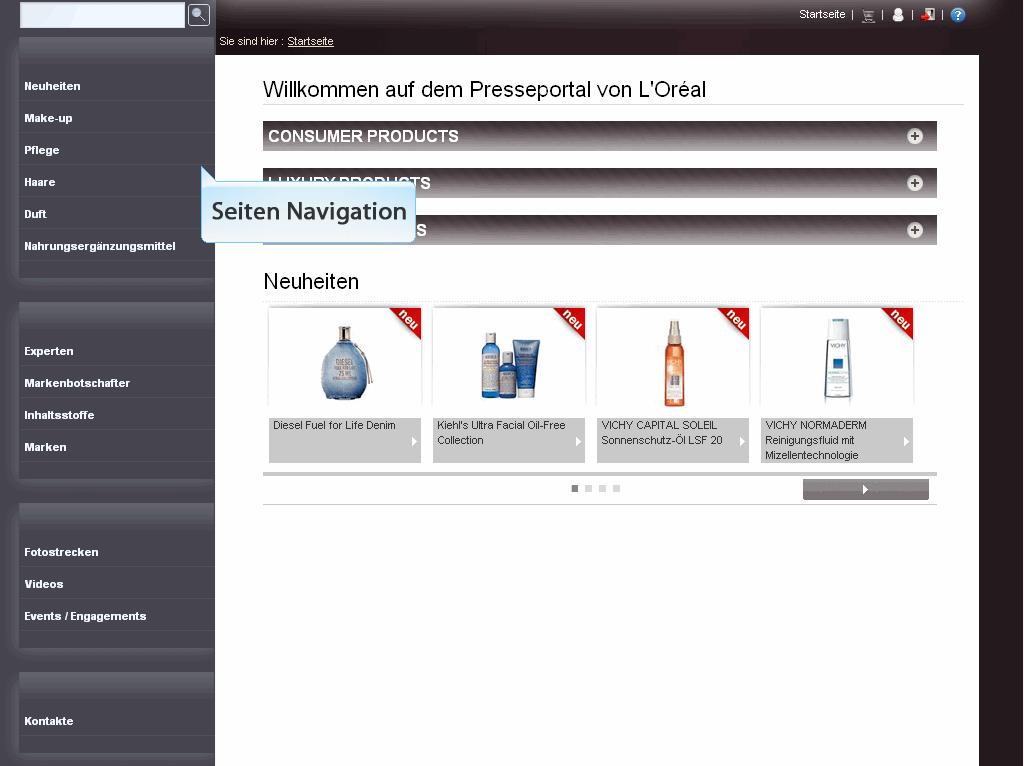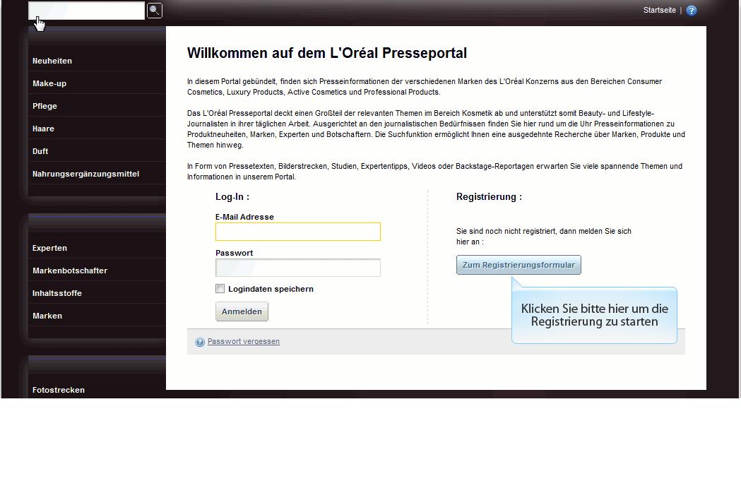 Mit Klick auf einen Bereich aus der Liste unten, erhalten Sie hilfreiche Erklärungen und Bildschirmvideos zum Presseportal der L'Oréal-Marken. Zum Abspielen der Videos, klicken Sie die verkleinerten Bilder an. Das Video öffnet sich dann in vergrößerter Ansicht.