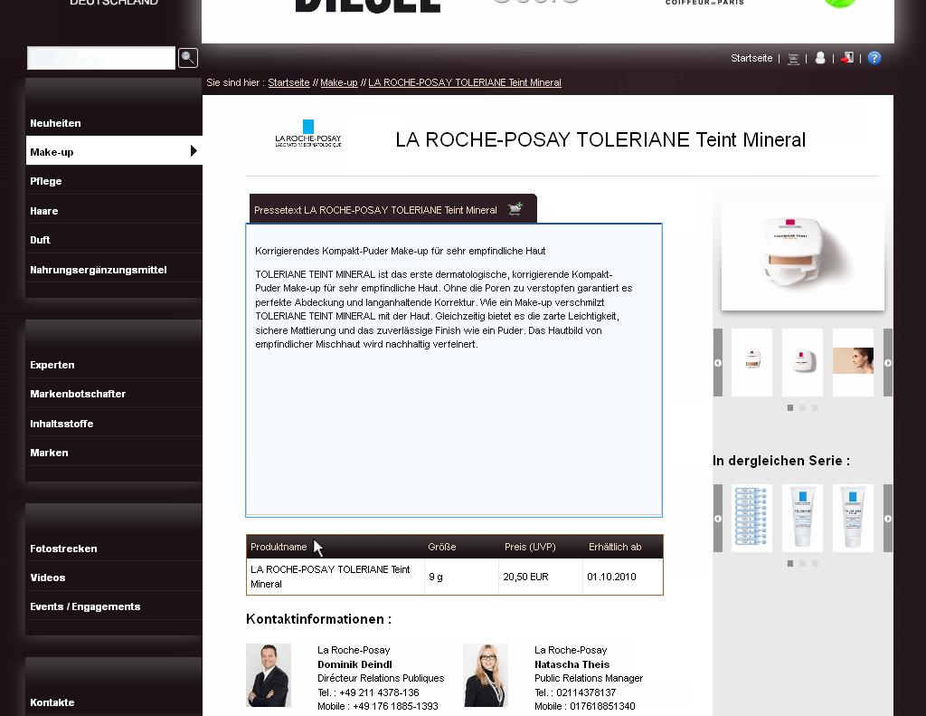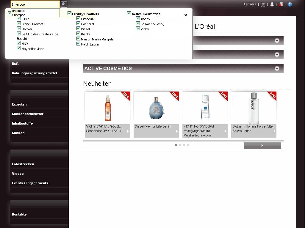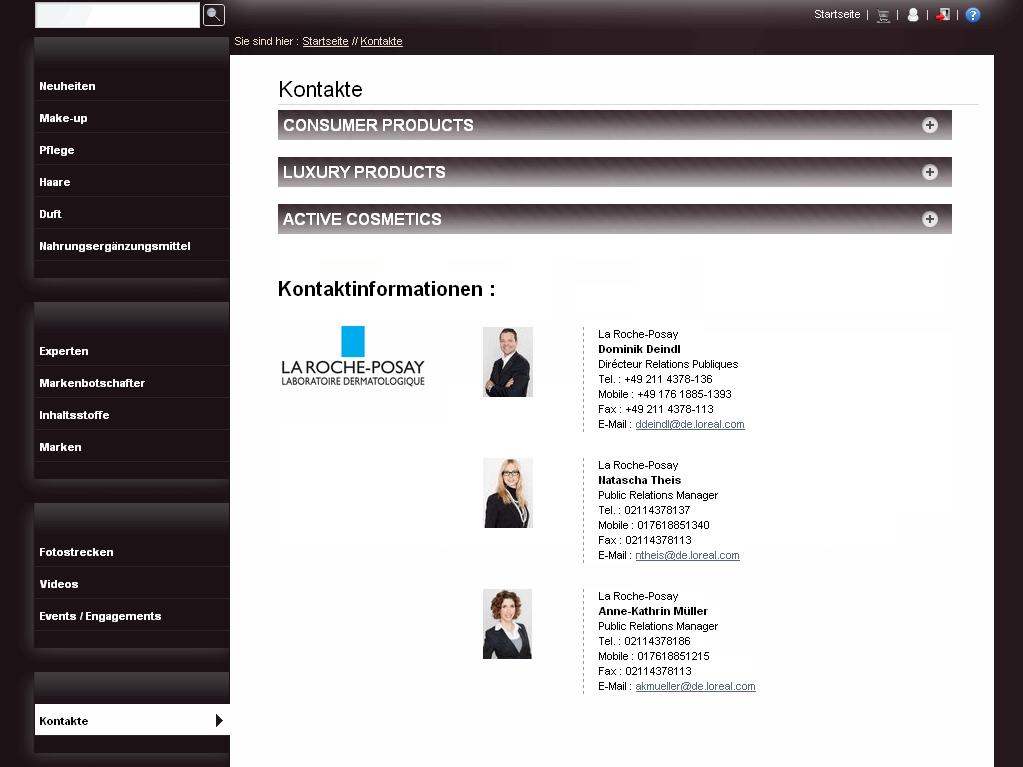 Die Kontakte sind den Bereichen "Consumer Products", "Professional Products", "Luxury Products" und "Active Cosmetics" zugeordnet. Die zugeordneten Marken öffnen (und schließen) Sie durch einen Klick auf den gewünschten Bereich.