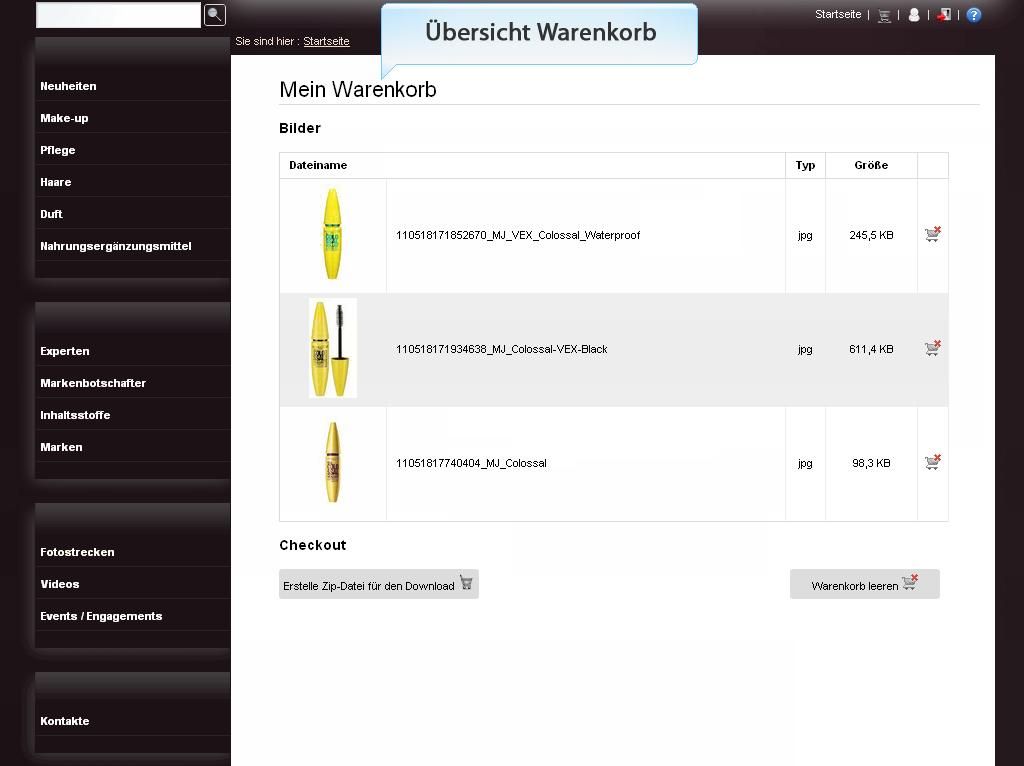 Den Warenkorb nutzen Sie, indem Sie eine Detailansicht (z.B. ein Produkt oder eine Fotostrecke) öffnen. Fügen Sie den gewünschten Inhalt dann mit Klick auf das Warenkorbsymbol zum Warenkorb hinzu.